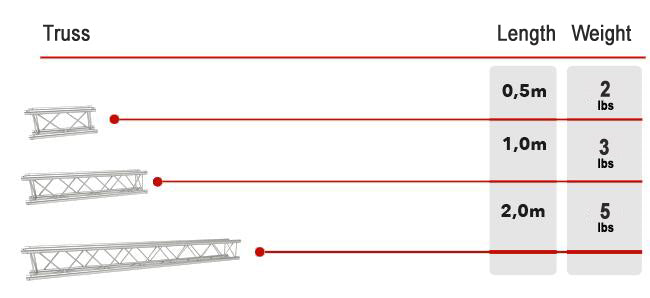 ProFlex Lighter-Duty Truss is light weight easy to set-up and is perfect for display stand exhibitions, mobile dj systems, decorative purposes and much more! This light, strong aluminum truss is 8.66” (220mm) x 8.66” (220mm) x .063” (1.6mm). Lighter-Duty Truss is available in square profiles in lengths of .5M, 1M or 2M lengths. Lighter-Duty Truss has maximum durability and minimum transport volume! It is is available in our standard aluminium finish, but is also available in a full pallet of powder coated colors so it fits any interior and can be used in wide range of applications and be part on any interior and exterior décor.