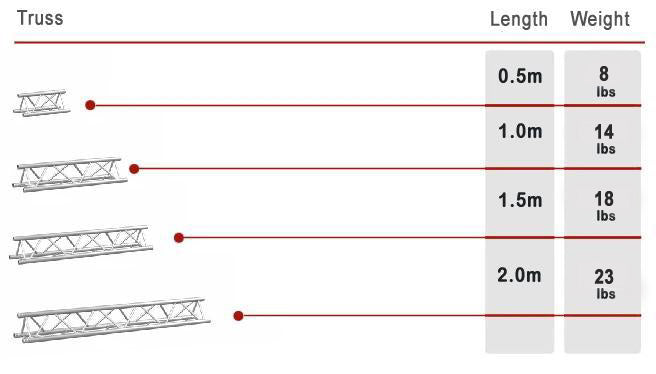 ProFlex Triangle Truss is contructed of a high grade aluminum contruction, ProFlex Triangle Truss consists of a 50mm (1.97") x 2mm (0.078") main tube and 20mm (0.79") x 2mm (0.078") braces. Hand crafted in Europe by TUV certified welders, ProFlex trusses are some of the strongest and best finished trusses on the market today. Each ProFlex truss has an ISO DIN 4113 and TÜV certificate which included the highest quality and saftey standards worldwide. Please note ProFlex trusses are compatible with Global Truss, Euro Truss and Dura Truss products. Please choose from the size options above.
